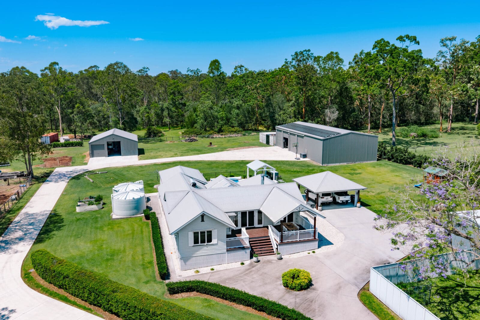 Beyond the home, the estate reveals a suite of infrastructure rarely found in lifestyle properties. High-load-bearing concrete driveway underscores the property’s robust infrastructure, perfect for trades, car enthusiasts, or those with heavy vehicles, floats, or trailers. A large, fully insulated machinery shed offers ample space for workshop operations and includes a professional-grade car hoist – a dream setup for trades, restorers, or collectors. With generous clearance, 3-phase power, and easy access via the reinforced driveway, this space is as practical as it is impressive. Further, a 20kw solar system supports the entire property, plus an additional 10kw battery.
